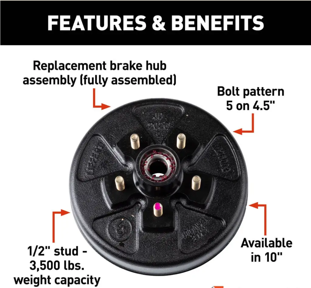 For peace of mind on the road, replace your brake hub with Lippert. This brake drum hub assembly fits a 3,500-lb. axle. It’s made from solid, durable iron and has a 5 on 4.5" bolt pattern with a 1/2" stud. All our brake hub assemblies come with a limited one-year warranty on the hub components. Please consult your original equipment before purchasing. Be sure to inspect and maintain your equipment periodically for optimal performance.