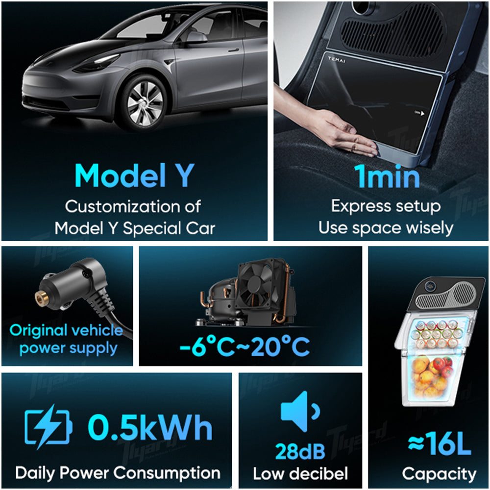 The 2025+ Model Y Juniper 16L Built-in Refrigerator Upgrade Compressor Cooler by Tlyard is a state-of-the-art, integrated cooling solution designed exclusively for Tesla Model Y owners. This sleek and compact refrigerator seamlessly integrates into your vehicle, offering a convenient way to keep food, beverages, and perishables cool on the go. With a 16-liter capacity, advanced compressor cooling technology, and a design that complements the Model Y's interior, this upgrade is perfect for road trips, daily commutes, or outdoor adventures.