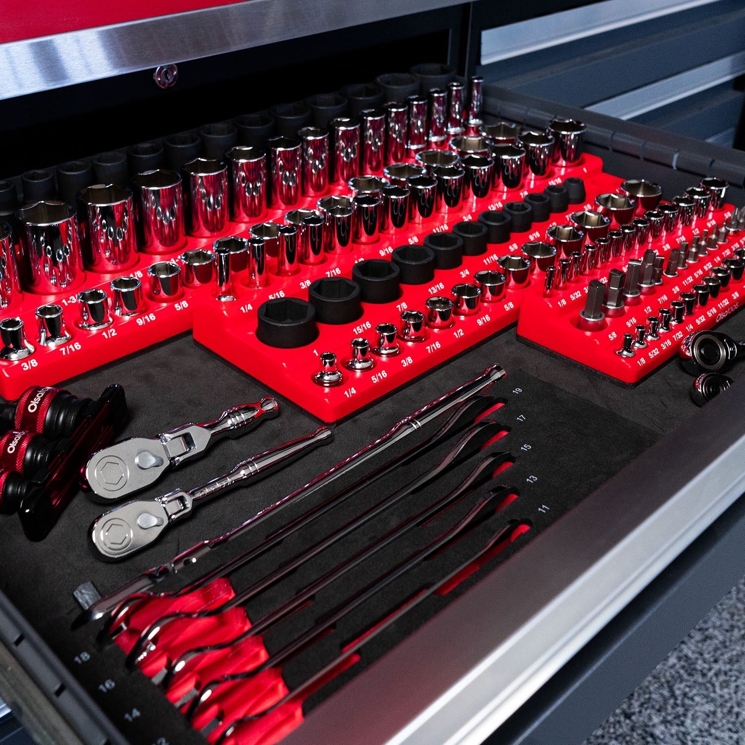 • Stores 75+ sockets (1/4", 3/8", 1/2" drive)
