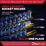 Holds up to 58 sockets (16x 1/2", 24x 1/4", 18x 3/8")